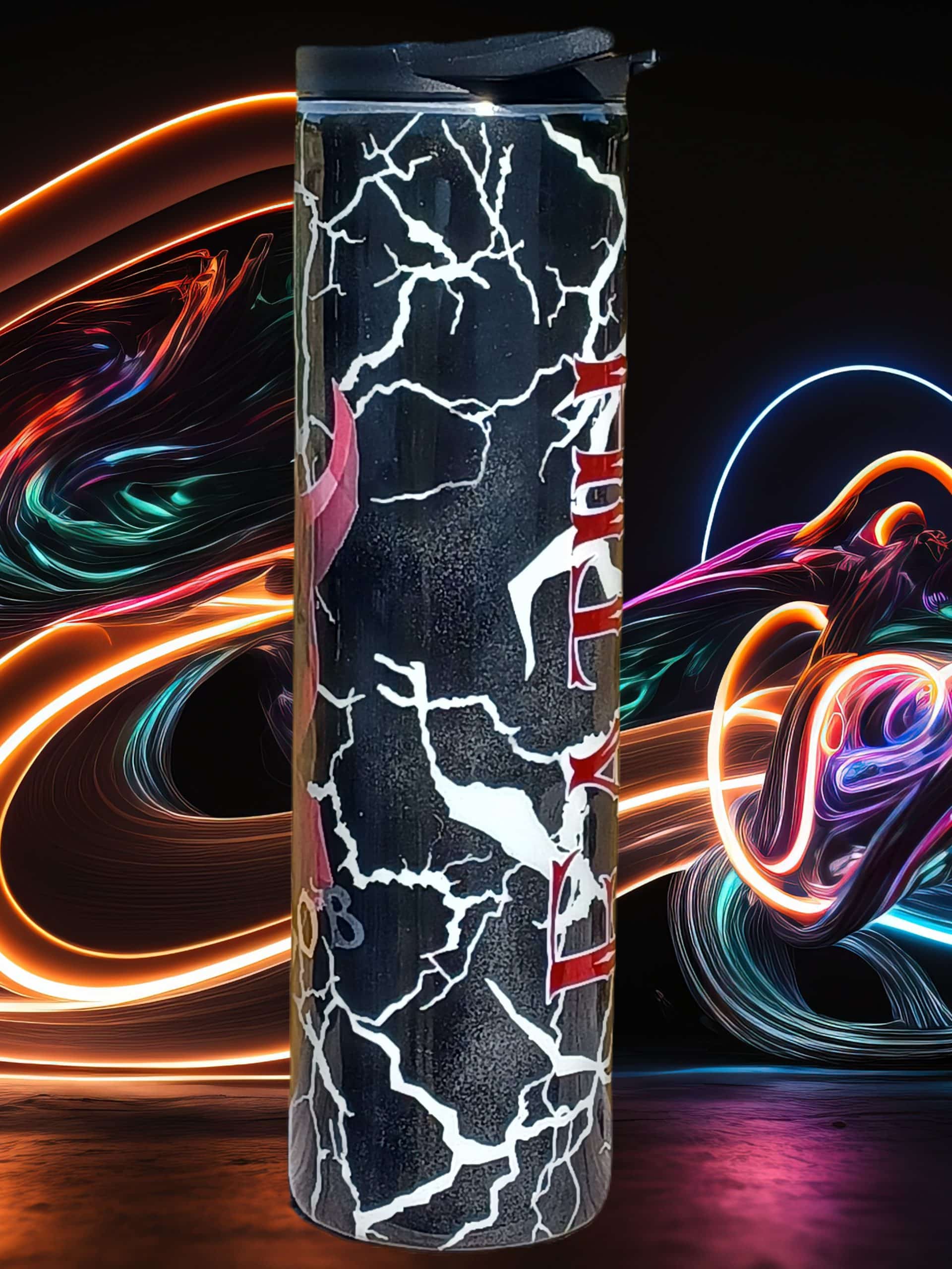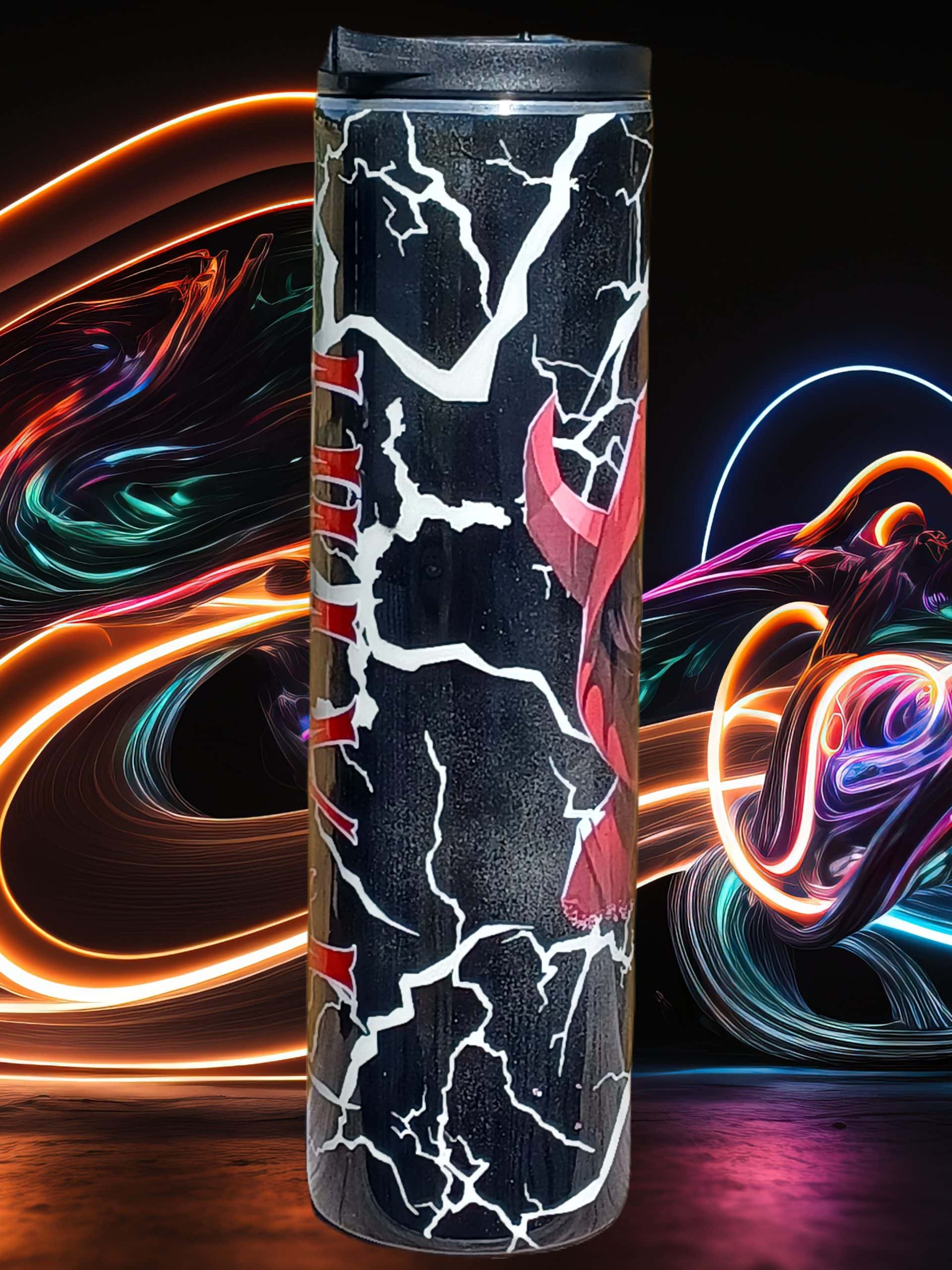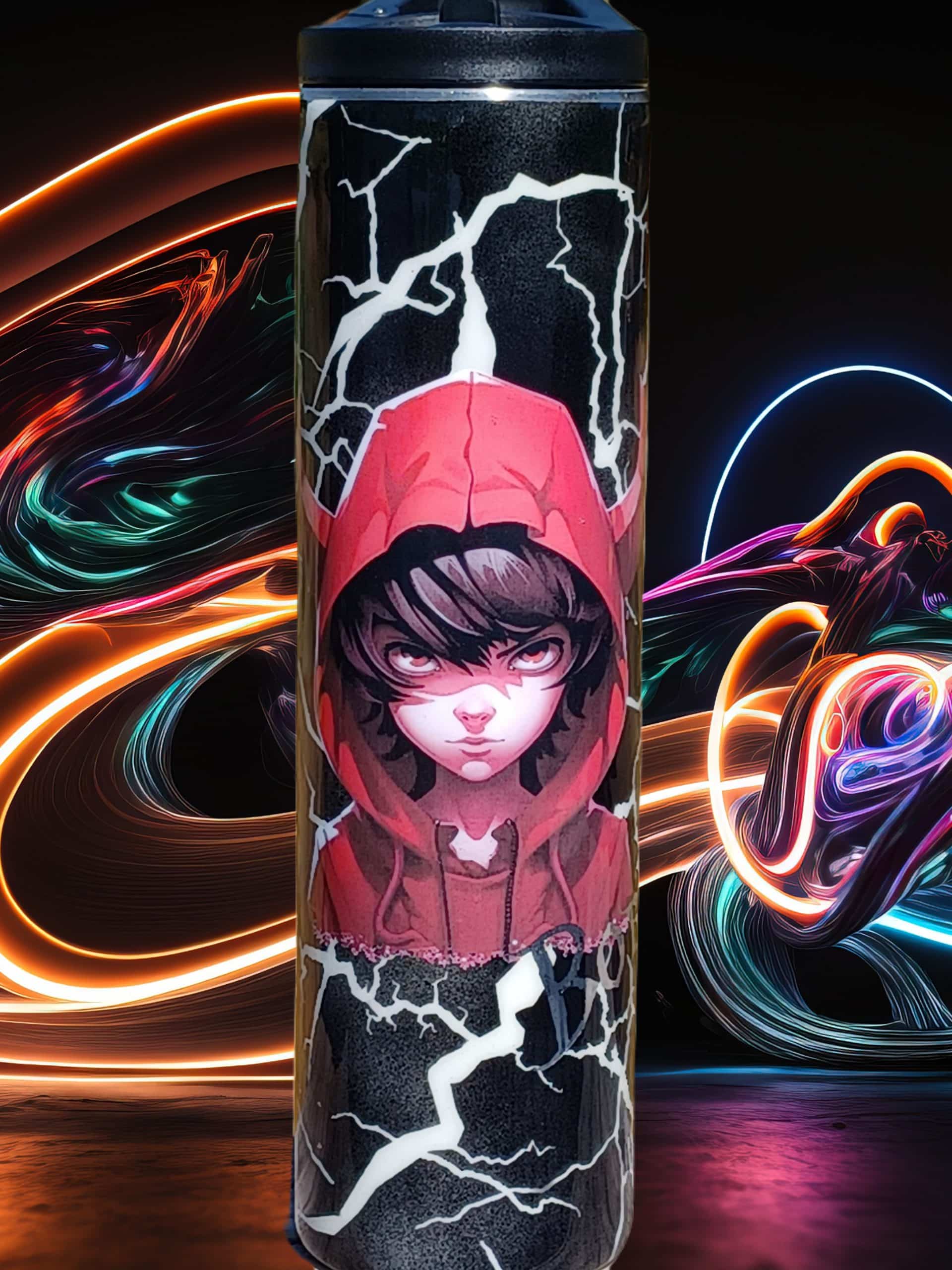 “Dark Spark unleashes electric attitude with bold anime vibes — a custom tumbler featuring a fierce hooded figure, crackling lightning, and glow-in-the-dark details. Perfect for fans of power, mystery, and striking style, day or night.”