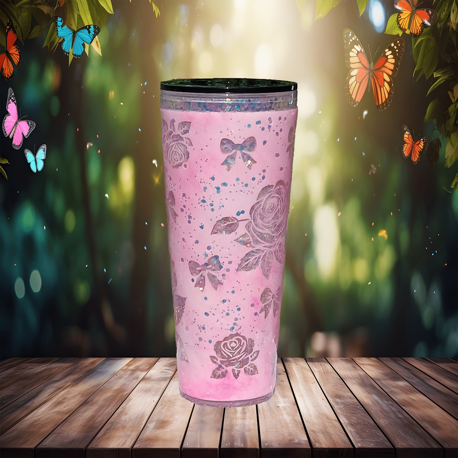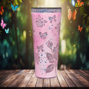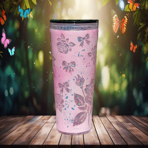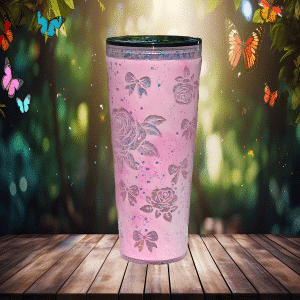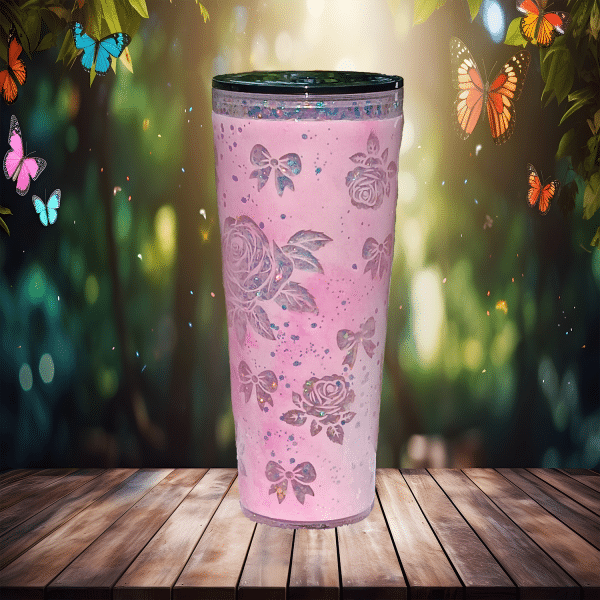 If sugar, glitter, and attitude had a baby—it would be this tumbler. Dreamy Petals Glitter is your portable burst of pink, bloom, and unapologetic sparkle. Covered in delicate rose outlines and floating bows, this beauty brings just enough “fairy princess” to distract from the fact that you’re also a walking storm cloud before coffee.