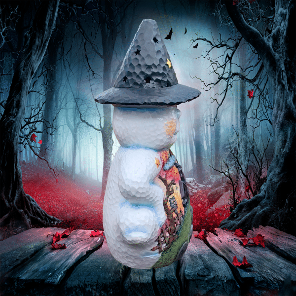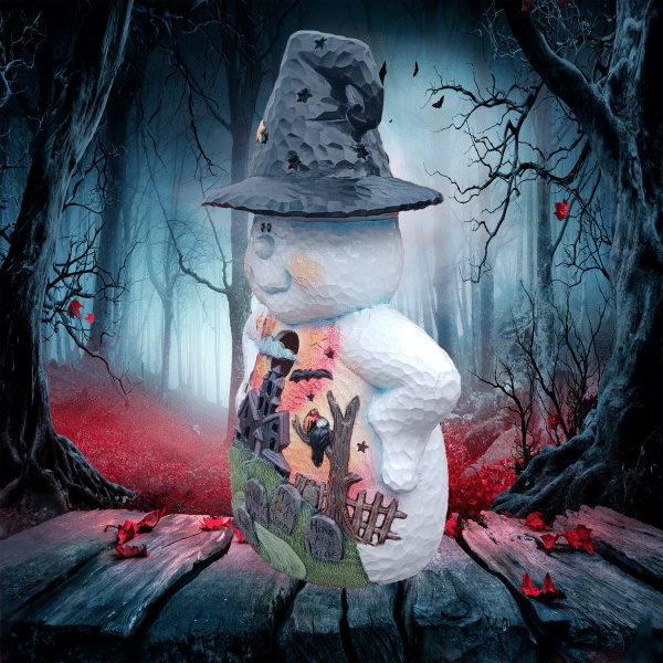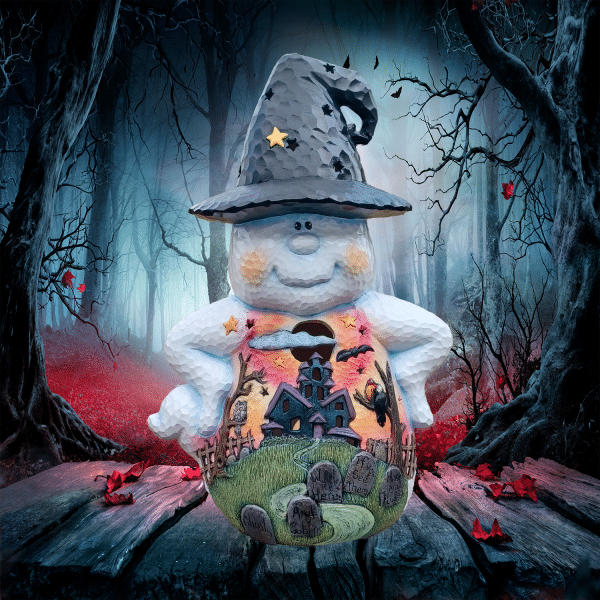 Plug this beast into the wall and watch as his hollow soul illuminates your room with haunted charm and suspicious warmth. His torso features a full-on graveyard gala complete with tombstones carved with ominous (and slightly passive-aggressive) warnings, a haunted house that probably still has dial-up internet, and a buzzard who’s clearly judging your entire life.