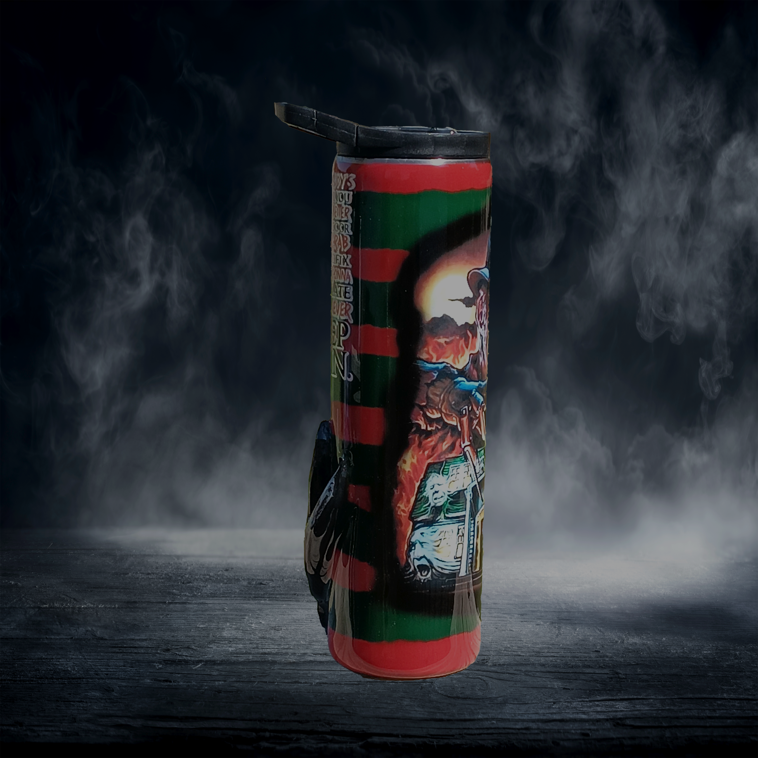 This ain’t your average cup—it’s a full-blown Elm Street experience. With Freddy front and center, flames blazing, house of horrors below, and that iconic rhyme lurking in the background, this tumbler doesn’t ask for attention—it claws its way into it. Oh yeah, and did we mention the 3D Freddy glove? Because of course it has a freakin’ glove.