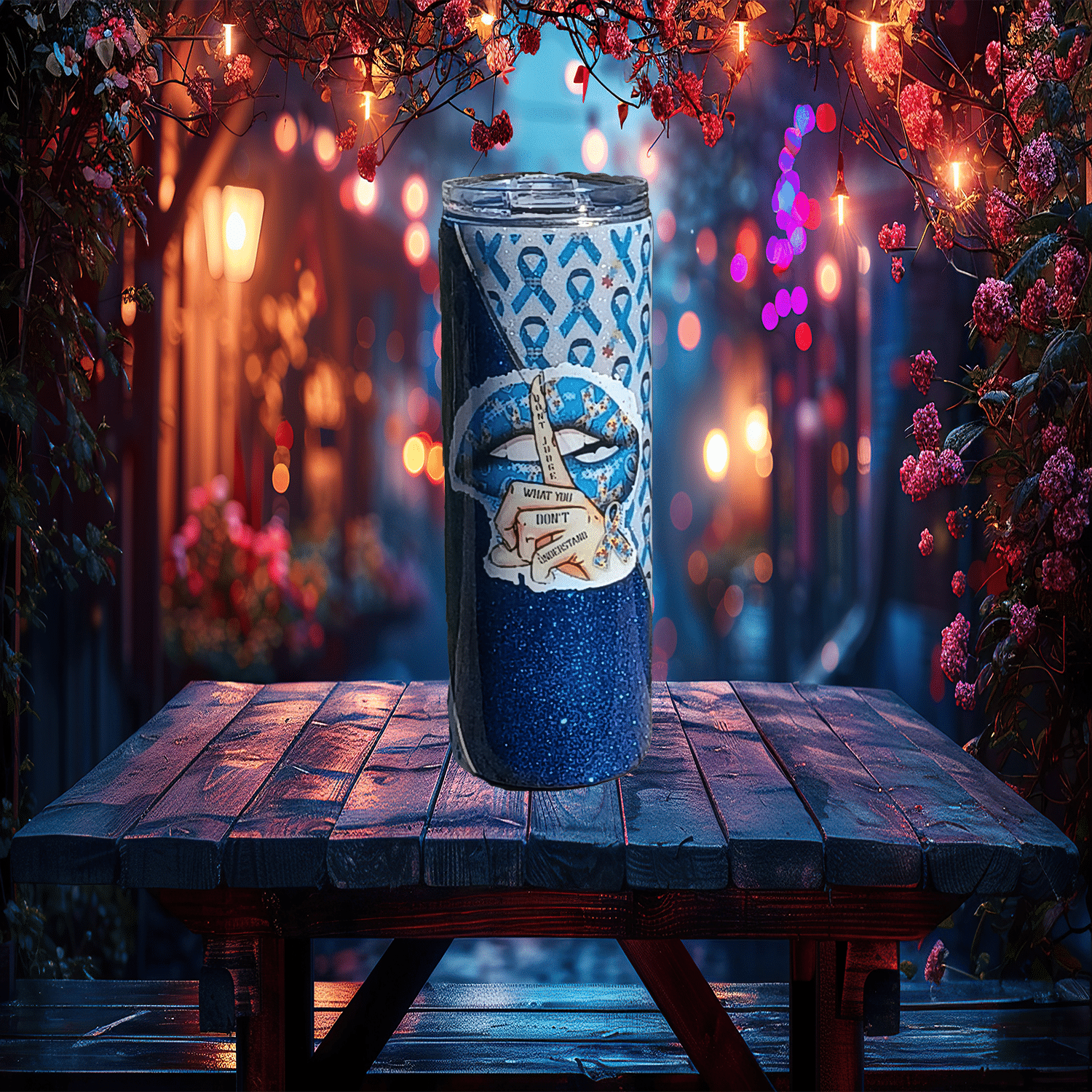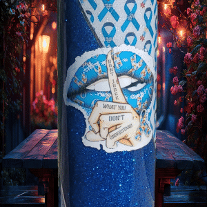 Wrapped in a fabric of support ribbon patterns, this design features a dual-toned contrast of shimmering sapphire and clean white texture. Front and center is a striking graphic: an awareness ribbon pierced by arrows and adorned with a directional sign that reads, “Dont judge what you don’t understand.” This message speaks volumes, even when the world doesn’t listen.