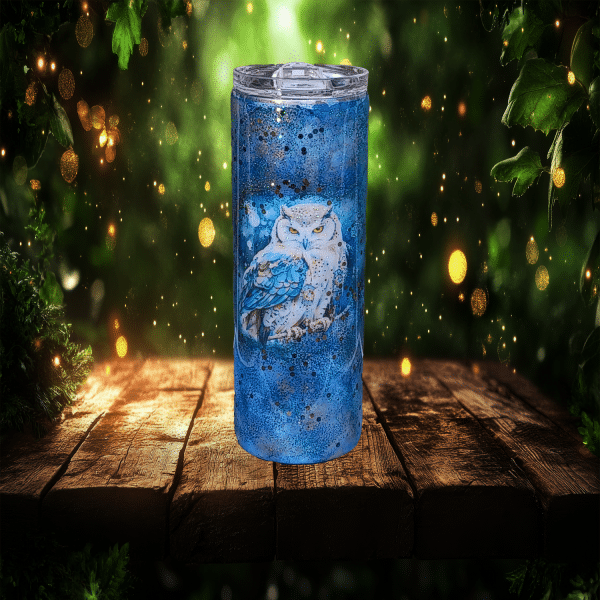 Let your drink take flight with Twilight Gaze, a spellbinding custom tumbler that captures the serene power of a lone owl under a twilight sky. Wrapped in a deep, shimmering blue with flecks of starlight, this cup features a majestic white and blue owl perched in quiet watchfulness—its golden eyes sharp with ancient wisdom. The glossy glitter finish evokes the chill of nightfall, while the handcrafted details give this tumbler an enchanting, one-of-a-kind presence.