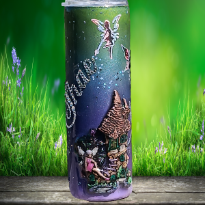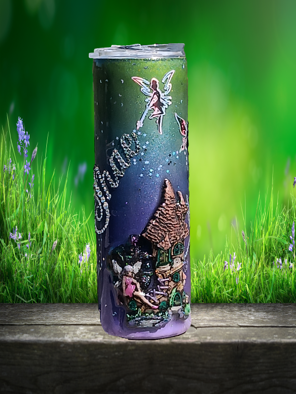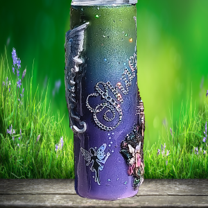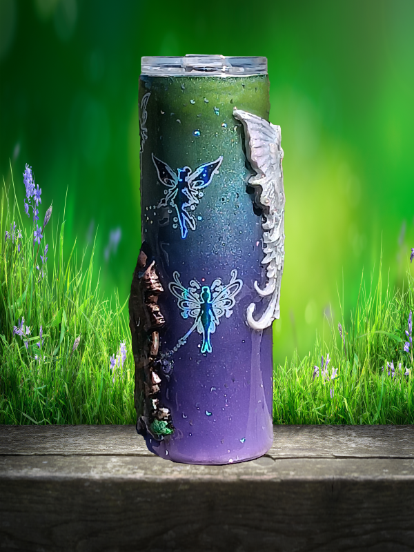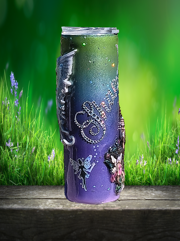 This enchanted tumbler is kissed in hues of deep forest green and violet twilight, crowned with a radiant 3D fairy whose wings shimmer like morning dew on dragonfly silk. Her presence is both fierce and delicate—guarding your brew like a secret whispered through ancient trees.