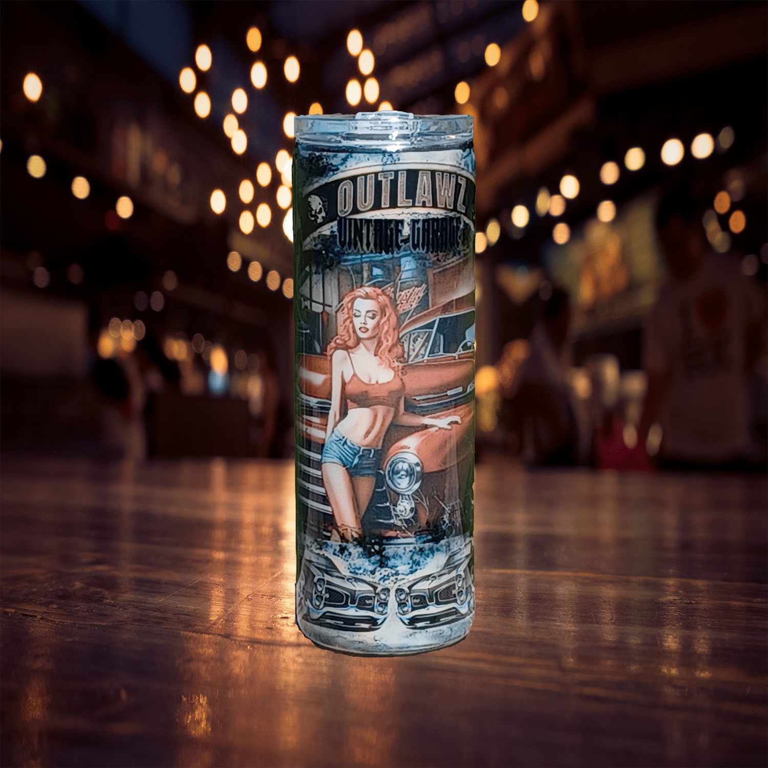 Rev up your day with the bold attitude of our Vintage Vixen Ride tumbler! This custom design features a classic garage pin-up girl leaning confidently against a vintage muscle car, set against a gritty retro backdrop of a vintage garage. The deep colors and detailed artwork give this tumbler the ultimate outlaw garage vibe.