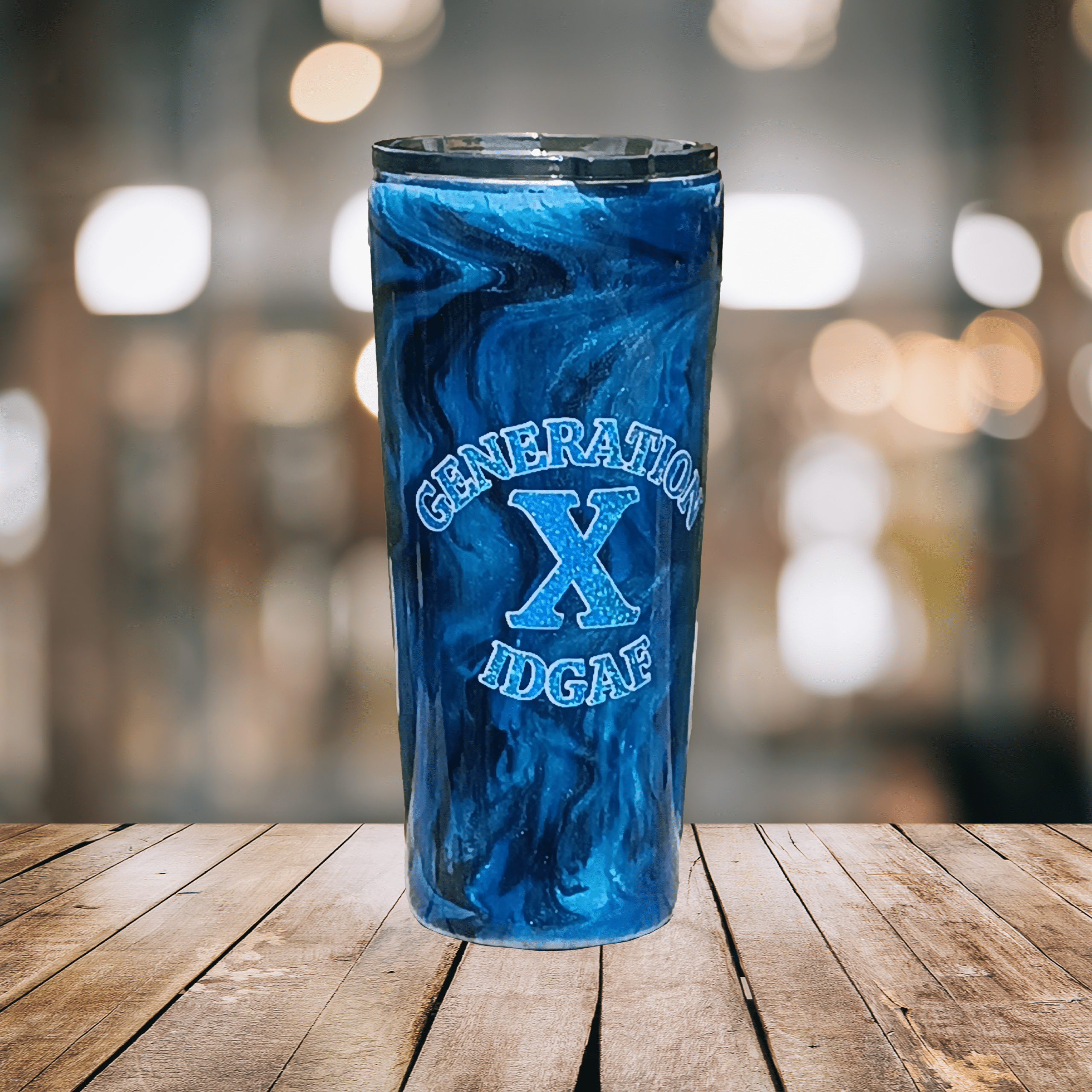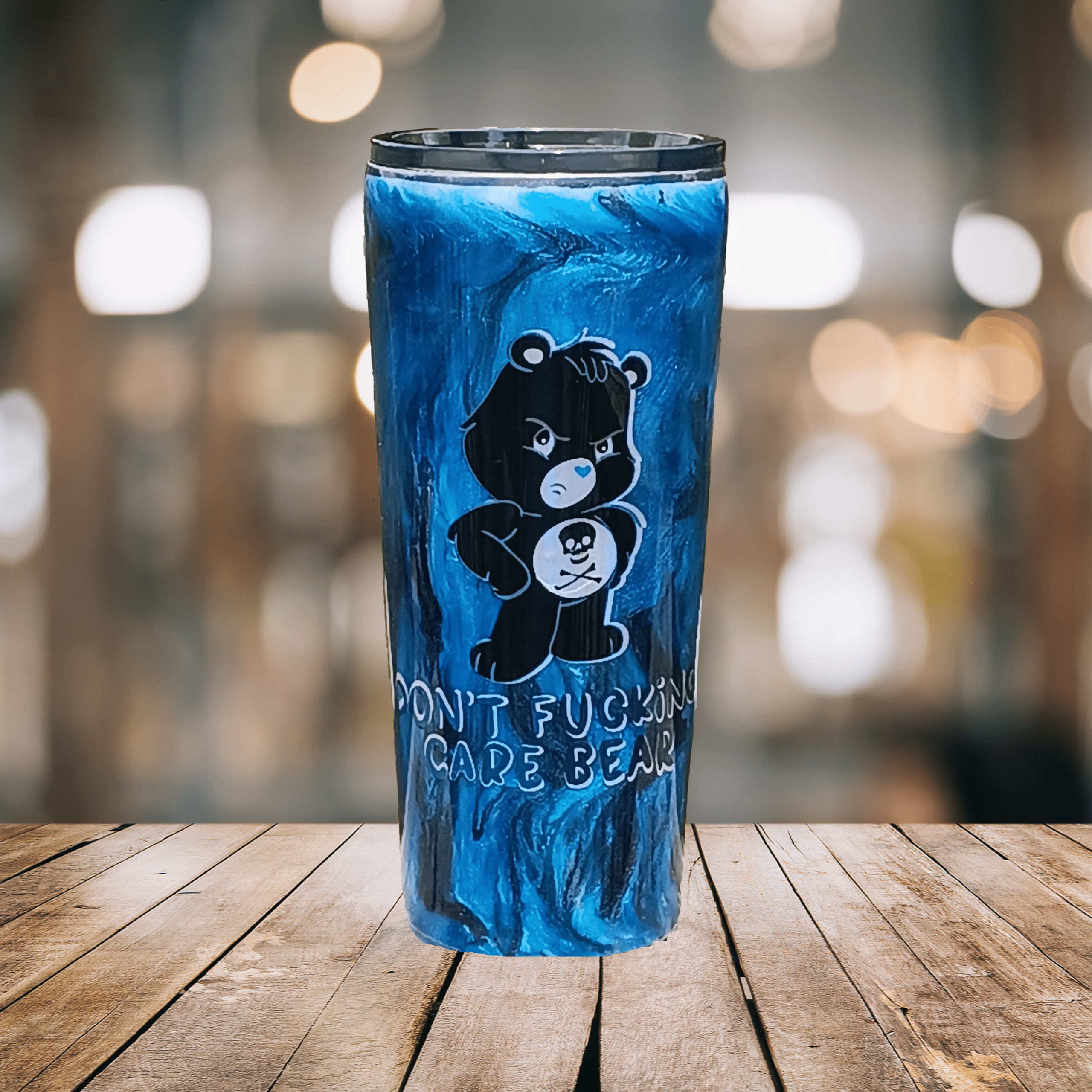 A savage twist on nostalgia! This ‘Don’t Care Bear’ tumbler mashes childhood cuteness with punky attitude and Gen X IDGAF vibes. Metallic blue swirls, glittery punch, and a big ol’ middle paw to the world.